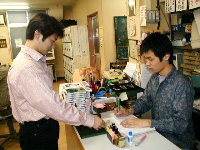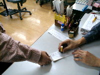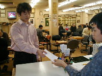 入場時に席料(入場料を含む対局料の事です)を支払い、ご自分の名前と棋力を言ってください。 (棋力とは、あなたの段級の事です。) 受付の手合い係が、「対局カード」に申告された事柄を記入します。 |